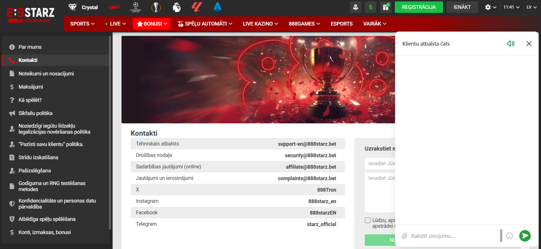 Neskaidrību gadījumā jūs vienmēr varat sazināties ar 888 starz klientu atbalsta centru, kas ir atvērts 24 stundas diennaktī, 7 dienas nedēļā, un ar to var sazināties, izmantojot tērzēšanu tiešraidē.