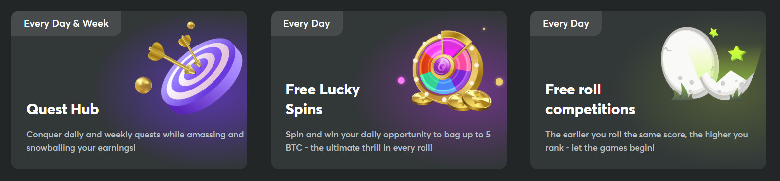 | Bezmaksas Lucky Spins | Aktīvi spēlētāji, vairāk spinu ar augstāku VIP līmeni un apgrozījumu | Ikdienas spini ar iespēju laimēt līdz 5 BTC |