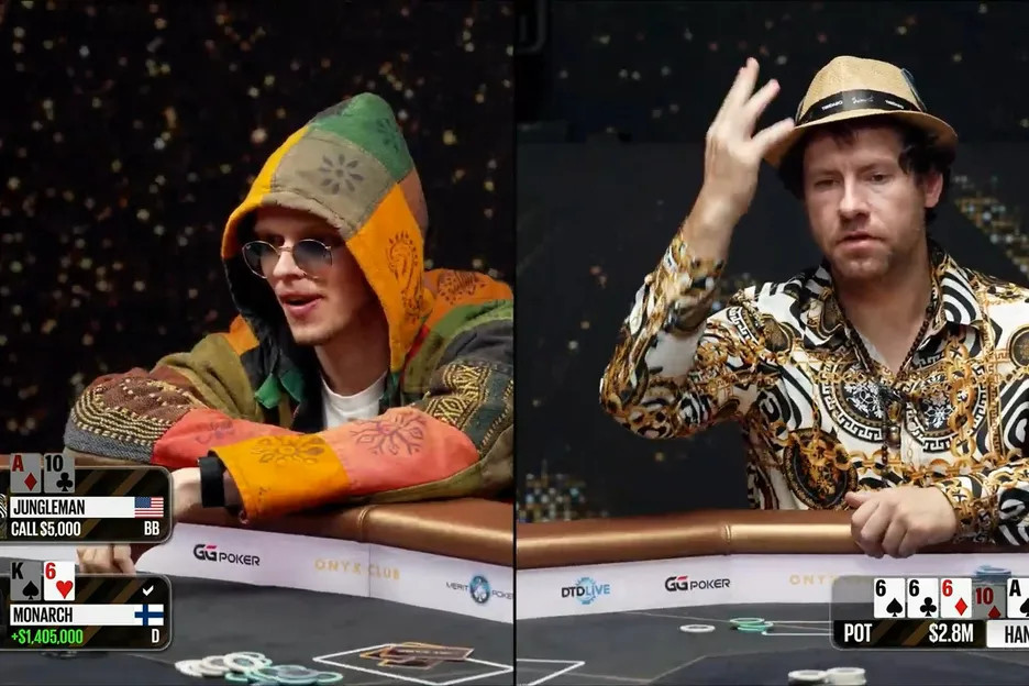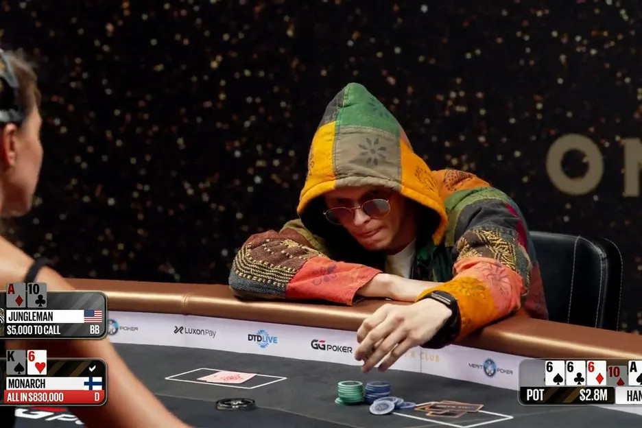 Drīz vien viss apgriezās pretēji – Jungleman uztaisīja flush, bet pēc tam pat royal flush ar 10♣9♠ uz A♣K♣Q♣J♣ galda. Pats Monarch atzina: “Tas šķiet sarunāts.”