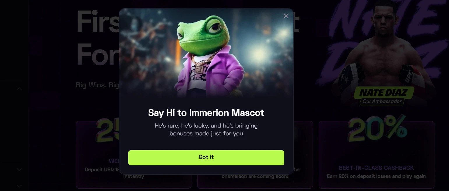 Immerion tiešsaistes kazino nav par tukšiem solījumiem – šeit katra spēle ir Tava laika vērta. Tas ir kazino, kur spēlētāji tiek atalgoti par spēlēšanu, bonusi nozīmē vairāk nekā tikai ciparus, un atbalsts ir vienmēr rokas stiepiena attālumā.
