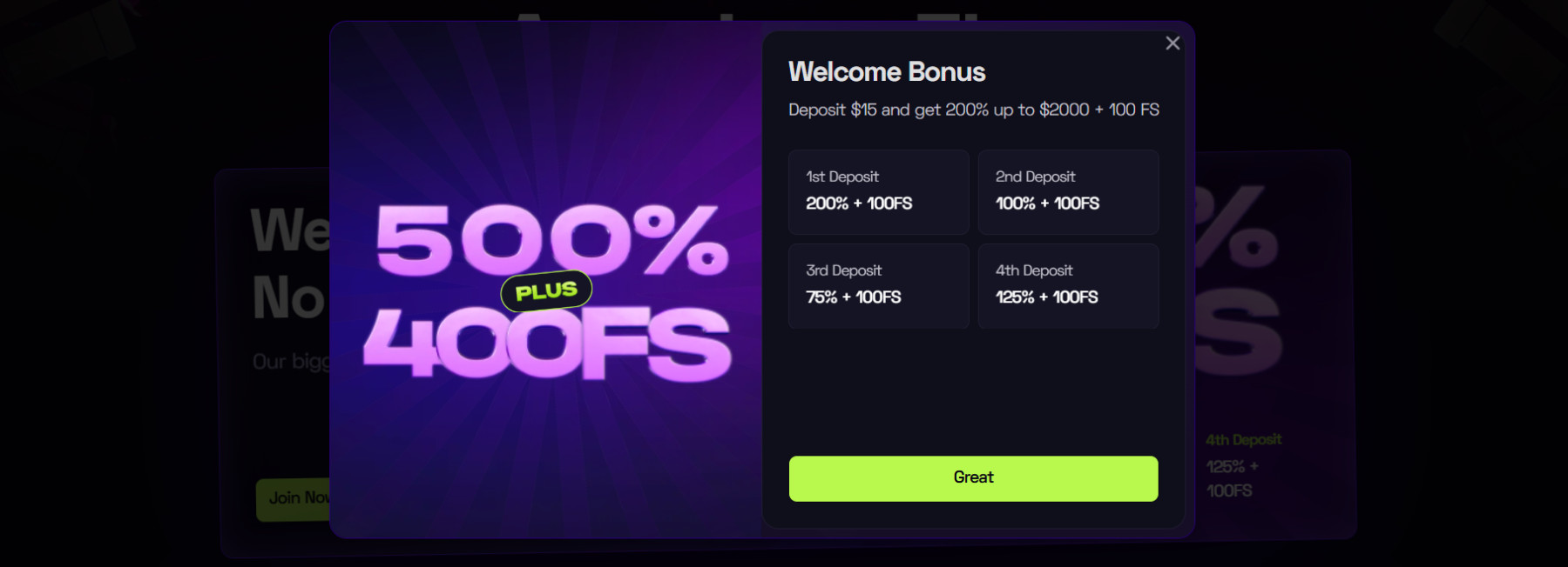 1. depozīts – 200% līdz $2 000 + 100 bezmaksas griezieni