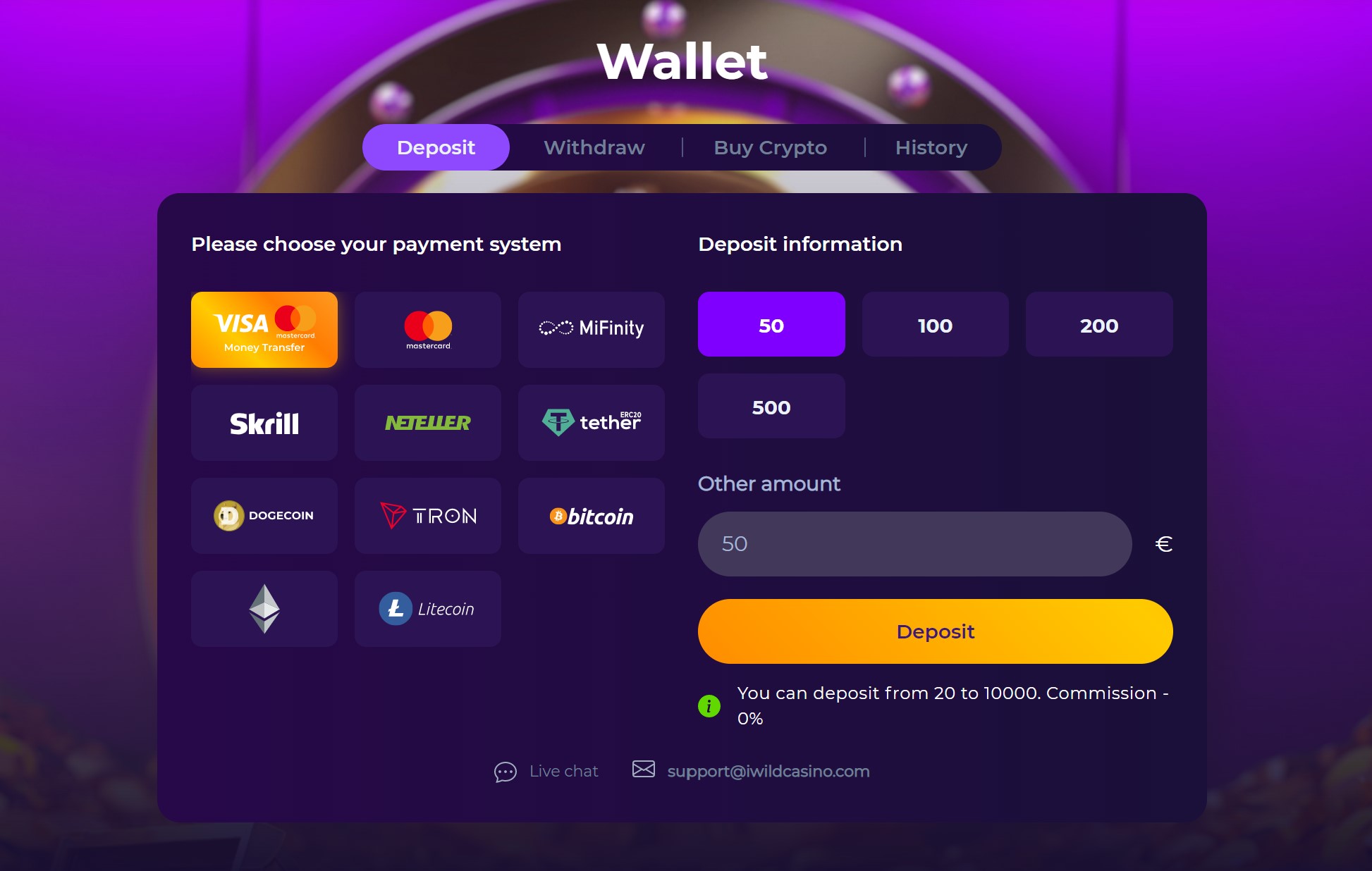 iWild kazino maksājumi ir elastīgi — pieejamas gan klasiskās metodes, gan kriptovalūtas risinājumi. Spēlētāji var izmantot Bitcoin, USDT, Tron, Ethereum, Litecoin, Digitalcoin un Binance Coin.