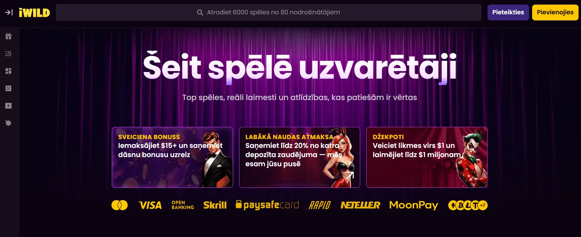 iWild platforma piedāvā tīru un pārskatāmu dizainu, kas ļauj viegli pārvietoties starp dažādām sadaļām. Sākumlapā ir apvienotas visas svarīgākās funkcijas — maksājumu iespējas, pieejamie bonusi un spēļu kategorijas.