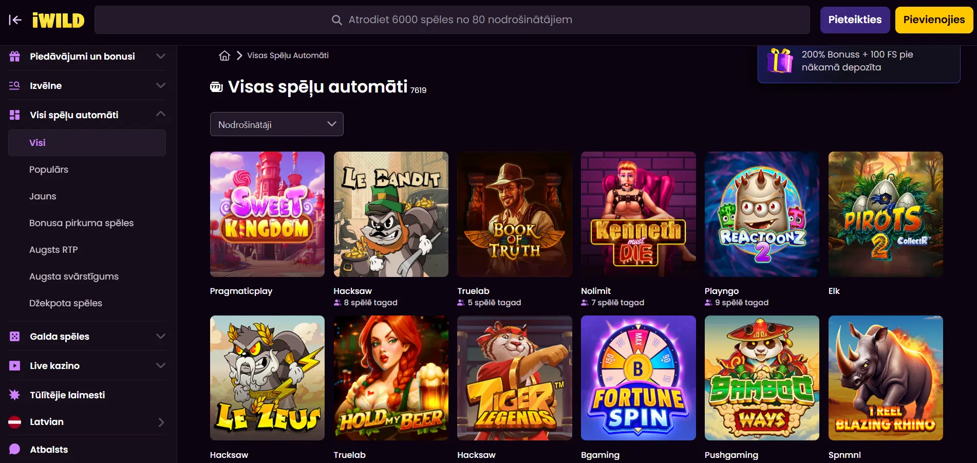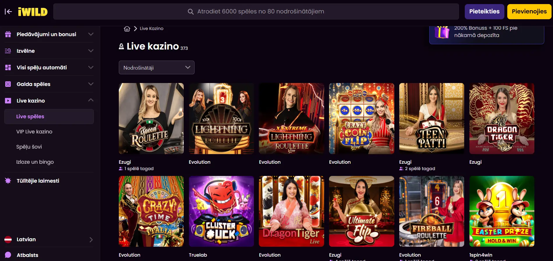 Nē, iWild nesniedz sporta likmju iespējas. Tā uzmanības centrā ir tikai kazino spēles — spēļu automāti, galda spēles, live dīlera spēles un tūlītējās uzvaras iespējas.