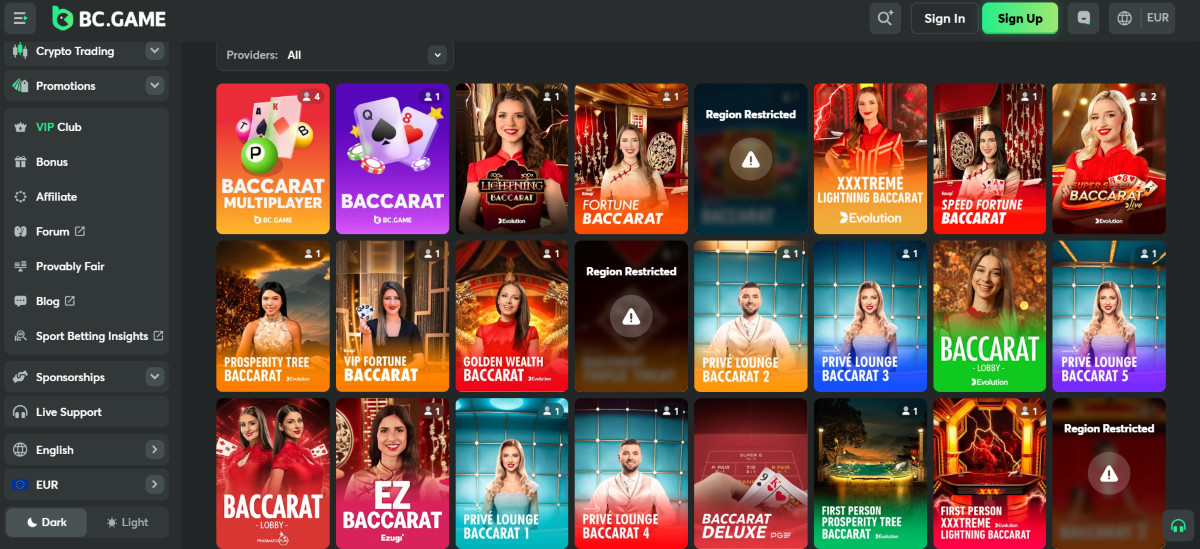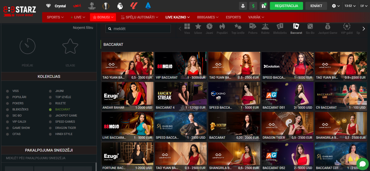 Baccarat spēles var atrast daudzos tiešsaistes kazino, BC.Game, Stake un 888starz.