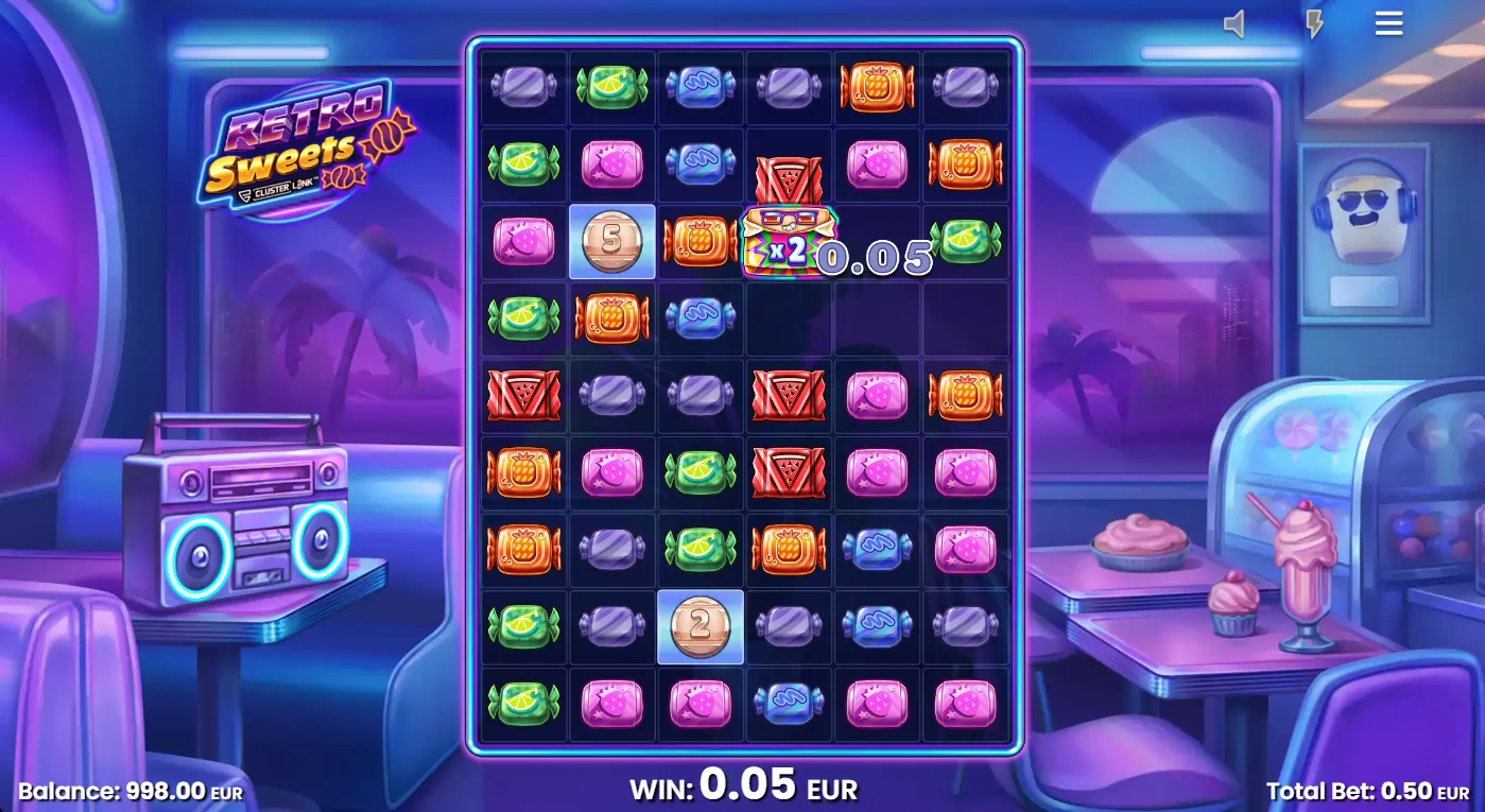 Retro Sweets piepildīts ar košām kombinācijām un ķēdes reakcijām. Simboli krīt, laimesti sprāgst un reizinātāji palielina tempu.