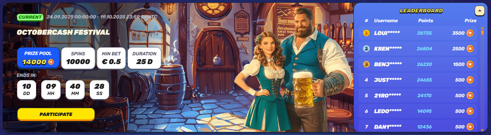 No 2025. gada 29. septembra līdz 19. oktobrim GambleZen kazino norisinās īpašs notikums — Octobercash Festivāls, kas apvieno spēlētājus no visas Eiropas aizraujošā sacensībā ar 14 000 € balvu fondu un daudzām iespējām kāpt rezultātu tabulas augšgalā.