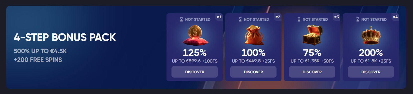 Saņem līdz pat 500% bonusu (maksimāli 4 500 €*) un 200 bezmaksas griezienus par pirmajām četriem iemaksām no 3,59 €.